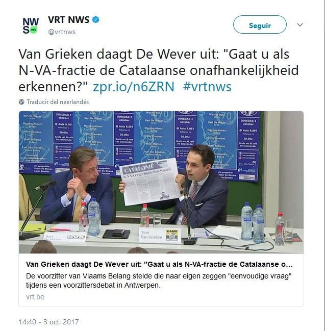 Impertinentes intromisiones en política interior de un Estado miembro de la UE (España) son causa común de los ultras flamencos. En la imagen, el líder del @de_NVA su líder @Bart_DeWever junto al neonazi @tomvangrieken del @vlbelang utilizando Cataluña como plataforma: